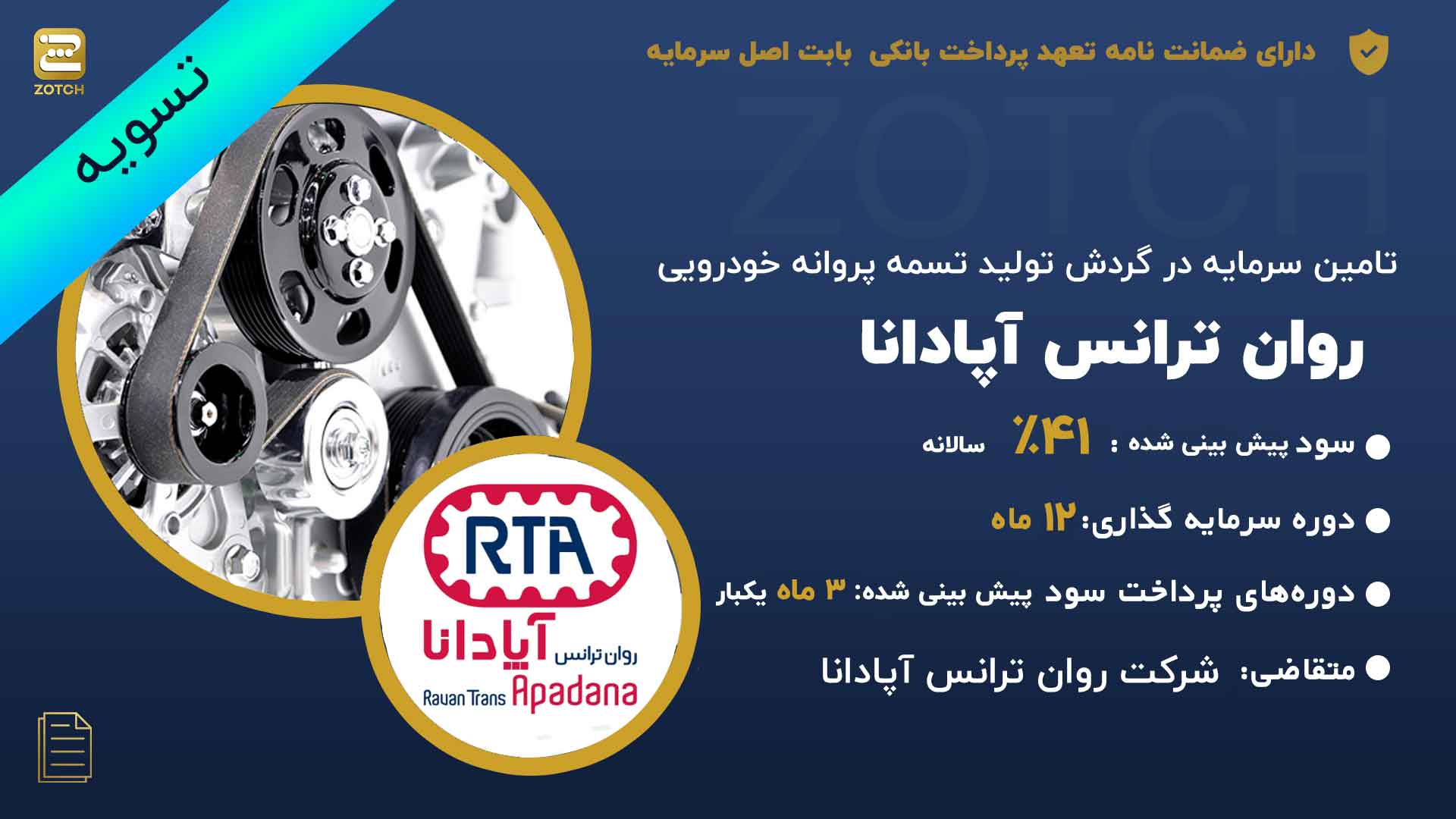 تسمه پروانه خودرویی مورد استفاده در گروه های بزرگ خودروسازی کشور شامل ایران خودرو، سایپا می باشد. شرکت روان ترانس آپادانا برای تولید تسمه پروانه خودرویی نیازمند مواد اولیه می باشد که مبلغ کل منابع مورد نیاز برای تامین مواد اولیه این محصول در دو دوره پنج ماهه معادل 125,000 میلیون ریال می باشد. که 12,500 میلیون ریال آن توسط سهامداران تامین خواهد شد و شرکت برای ادامه کار، قصد دارد تا بخش باقیمانده معادل 112,500 میلیون ریال را از محل منابع مالی حاصل از تامین مالی جمعی از طریق سکوی تامین مالی زچ، تامین نماید. 95 درصد مواد اولیه مورد نیاز تولید محصولات این شرکت از طریق واردات تامین می گردد که در هر سفارش یک ماه دوره رسید کالا و تولید و یک ماه فروش و تحقق درآمد و یک ماه دوره وصول مطالبات می باشد. که در هر سال مالی 2 بار دوره گردش موجودی و سرمایه این شرکت می باشد. حجم تولید و فروش این شرکت در هر دوره تولید محصول 3,321 کیلوگرم با قیمت فروش 57,672,764 ریال و مجموع مبلغ فروش 191,531 میلیارد ریال در هر دوره گردش میباشد.