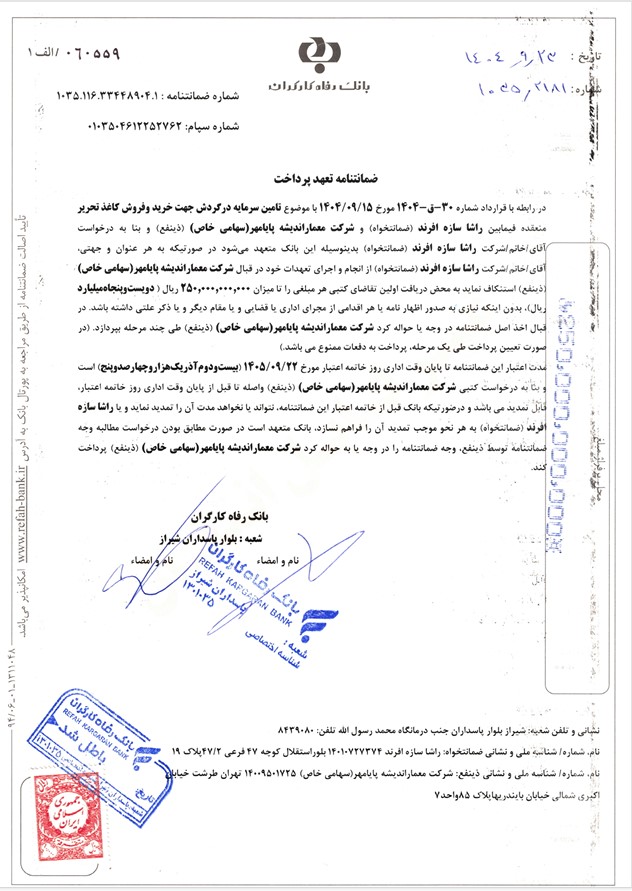 و با تضمین ضمانت نامه تعهد پرداخت بانک رفاه کارگران برای اصل سرمایه